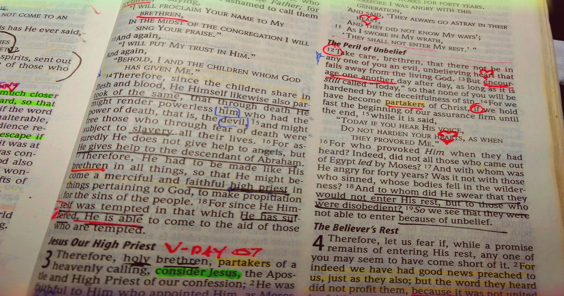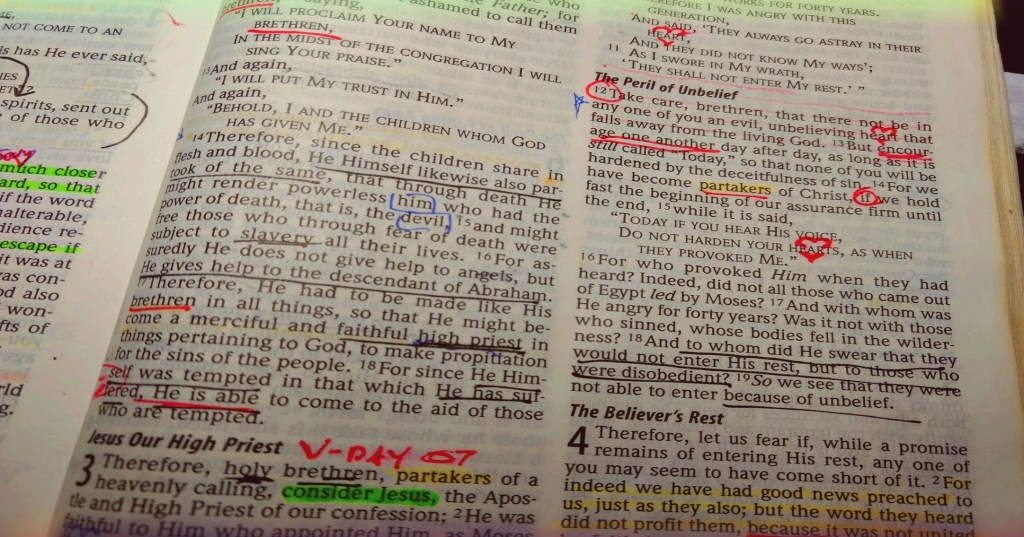 Thinking to buy a Bible I’ve previously used, I grabbed the one I had in Bible college to “test drive” the format. I started reading Hebrews. Apparently, we worked through Hebrews 3 on Valentine’s Day 2007. I wrote “V-DAY 07” next to the heading. The record shows I drew red hearts around all the instances where the word heart appears also. This Bible is very marked up, and this morning it led to the following observations and reflections: